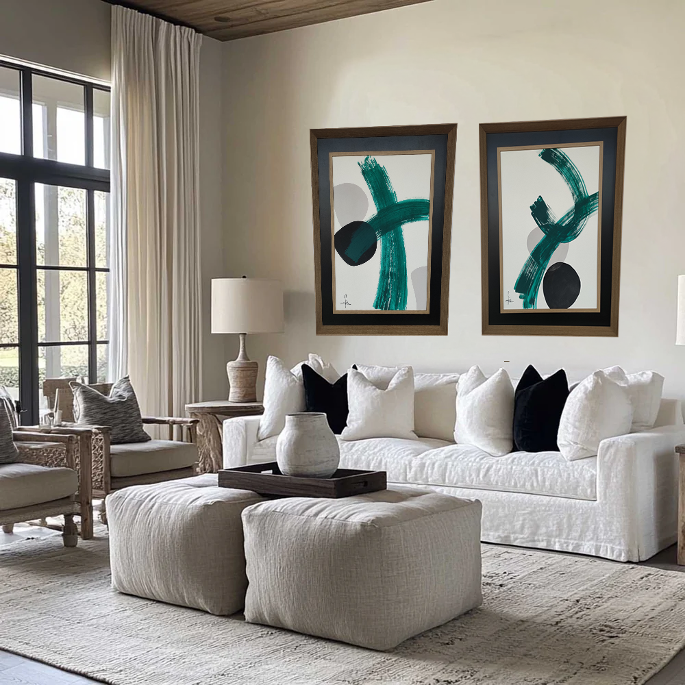 Obra original pintada a mano por nuestras artistas para decorar espacios modernos que buscan energía, frescura y un toque artístico distintivo. El trazo amplio en tonos verde esmeralda, combinado con formas suaves en gris y negro, crea una composición dinámica ideal para salones contemporáneos, oficinas creativas o zonas de estudio inspiradoras.